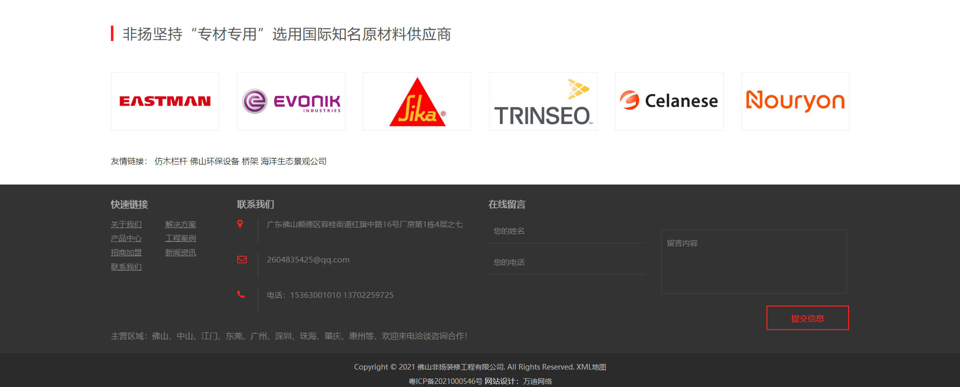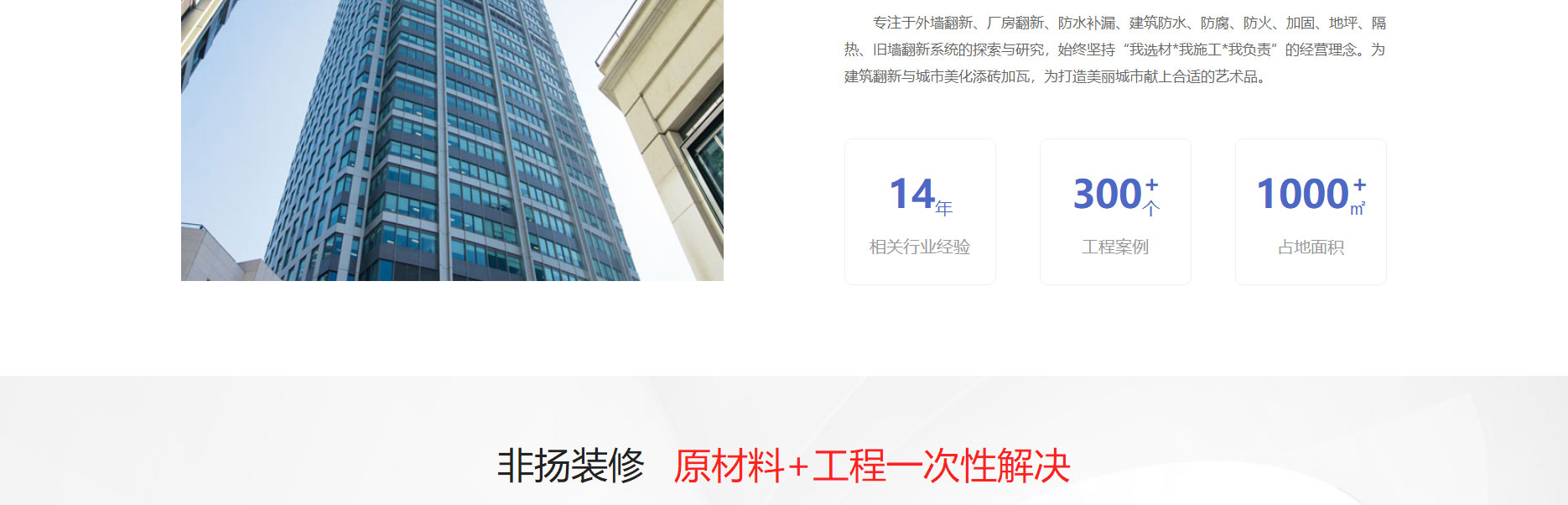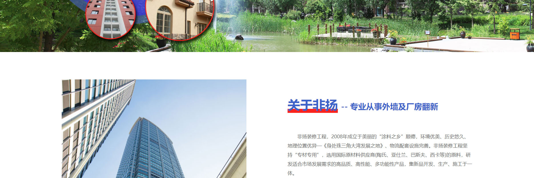 非扬装修工程,2008年成立于美丽的“涂料之乡”顺德,环境优美、历史悠久、地理位置优异—《身处珠三角大湾发展之地》、物流配套设施完善。非扬装修工程坚持“专材专用”,选用国际原材料供应商(陶氏、亚仕兰、巴斯夫、西卡等)的原料,研发适合市场发展需求的高品质、高性能、多功能性产品,集新品开发、生产、施工于一体。专注于建筑防水、防腐、防火、加固、地坪、隔热、旧墙翻新系统的探索与研究,始终坚持“我选材*我施工*我负责”的经营理念。为建筑翻新与城市美化添砖加瓦,为打造美丽城市献上合适的艺术品。